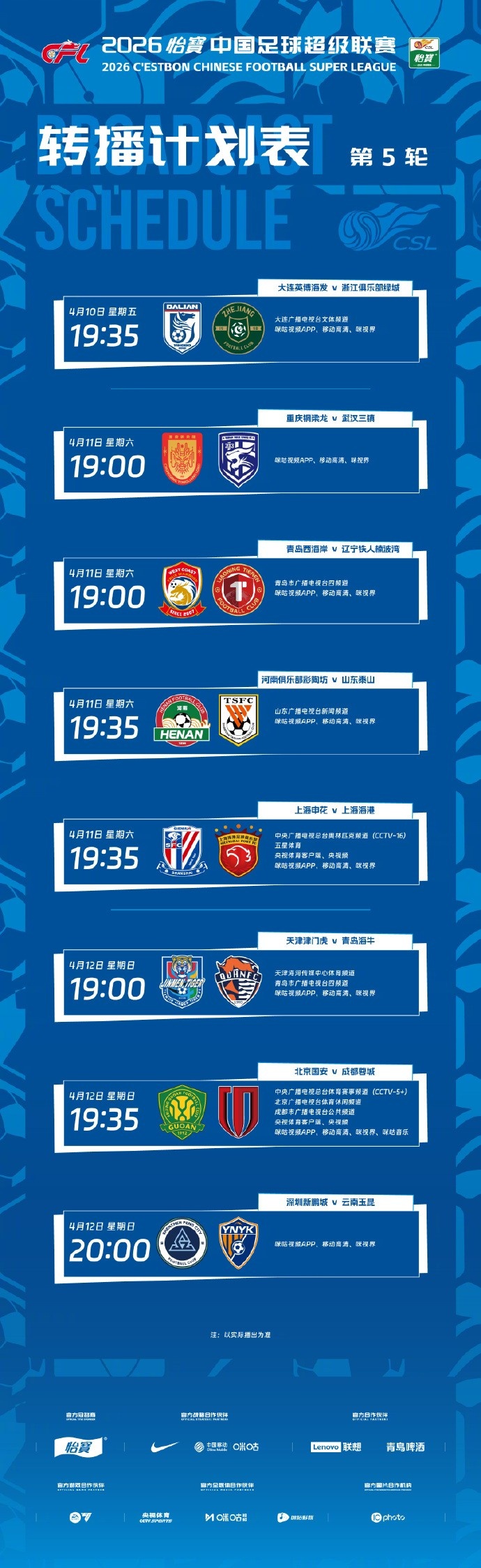 4月9日讯 中超官方公布第5轮转播计划,CCTV16转播上海申花与上海海港的上海德比,CCTV5+转播北京国安vs成都蓉城。
